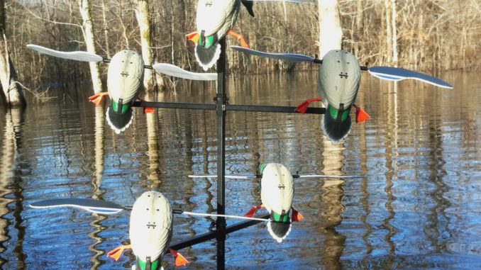 Great Day’s Hot Wings Decoy Tree positions five spinning wing decoys into a group that gives the appearance of multiple ducks landing.