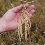 The remaining two types of brown fields have been managed for two crops of rice and are not flooded at the moment. Some, with obvious machinery tracks through them, have been stripped of their second crop of rice for the year by tracked combines. The remainder, with heavily nodding heads of mature rice kernels, are awaiting harvest.