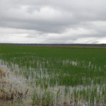 Brown patches come in three flavors. Some are brown-topped, with green shoots coming on from the plant bases. These fields had a single crop of rice harvested earlier in the year and are now, in the fall, flooded for crawfish production.