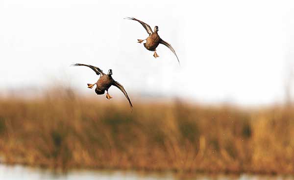 We hunkered lower and plastered our faces against the cane. Uh-oh, at about a hundred yards, the lead duck was definitely veering. The others followed. We mouthed the calls in desperation just as they swerved, and we saw the white of the underwings contrasting against the dark bellies. “Blacks” for sure.