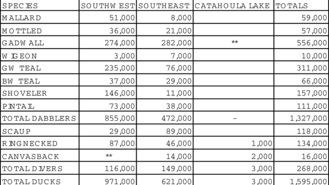 Although the distribution of ducks counted on coastal transects continues to be skewed toward southwest Louisiana, the 971,000 estimated there is less than the 1.3 million seen in 2008, while the 621,000 estimated in southeast Louisiana is markedly higher than the 419,000 in 2008. Most of that change came from an increase in the number of gadwalls seen in southeast, especially in the Biloxi marsh area, and the big decreases in the number of mallards, gadwalls, and blue-winged teal in southwest Louisiana. Noteworthy from this survey was the large decline in coots in southwest Louisiana from 620,000 in 2008 to 160,000 this year. An extremely low number of ducks were seen on Catahoula Lake compared to 74,000 in November 2008 and 104,000 last January.