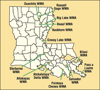 According to LDWF’s Randy Myers, the WMAs that offer the best hunting are those that lie within regions that naturally attract ducks as they come into Louisiana. The coastal area is the best overall region because of the wide variety of habitat from forested wetlands to highly productive marshes.