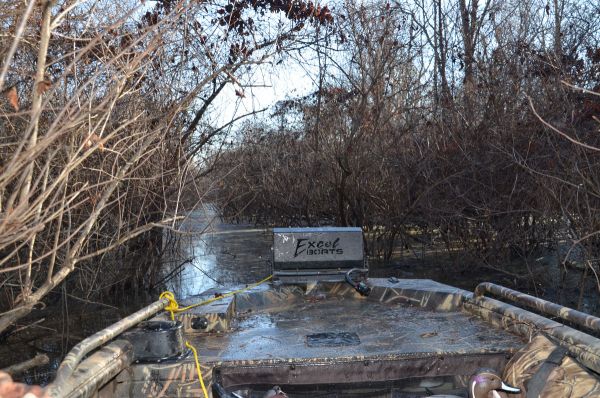 The trio knew where they were going, though, and soon the boat popped out into a pothole of open water approximately 75 by 100 yards.
