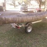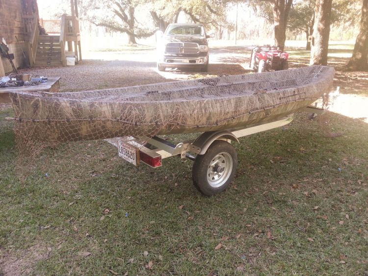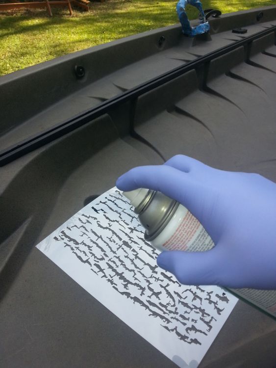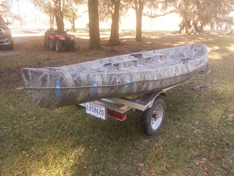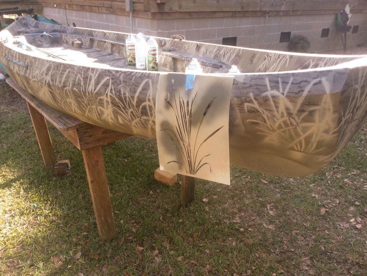 The first step is to paint the boat. Soileau used six colors of Rust-Oleum camouflage spray paint purchased at a local hardware store and Mossy Oak paint stencils purchased online.