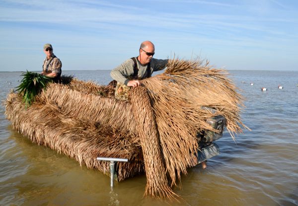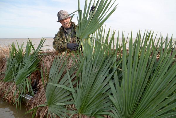 Attaway and Dupuis solve a host of problems by dressing their grass mat blind with palmetto fronds. The fronds break up the color and texture of the blind surface, they add greenery, and they provide overhead and facial cover for the hunters.