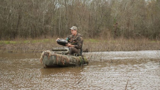 Kayaks are very mobile with a trolling motor. A small, 250-amp cranking battery and a 30-pound thrust motor will move the boat speedily. The battery can be used for three hunts before recharging is needed. (Soileau reminds hunters that running lights are required at night and boat numbers are needed on public waters.)