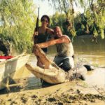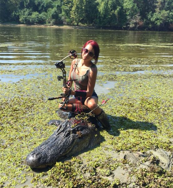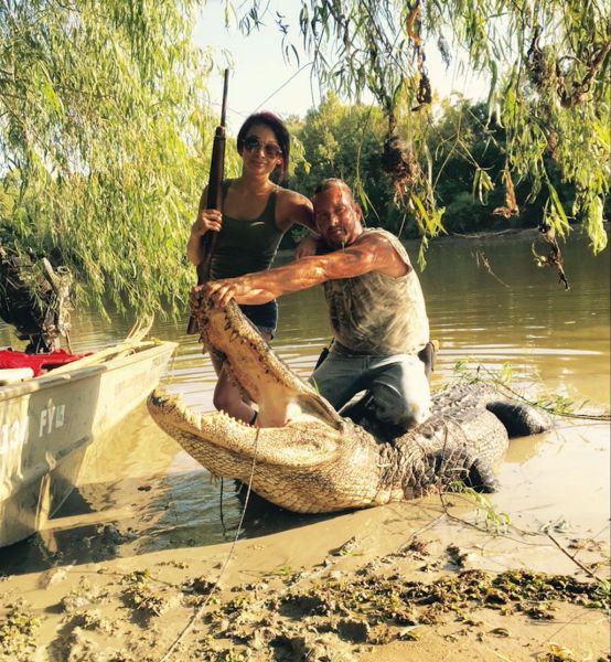 The gator headed into the water when they approached, so Rivers positioned Christina with a .22 Ruger rifle, then battled the beast up to surface for the kill shot.