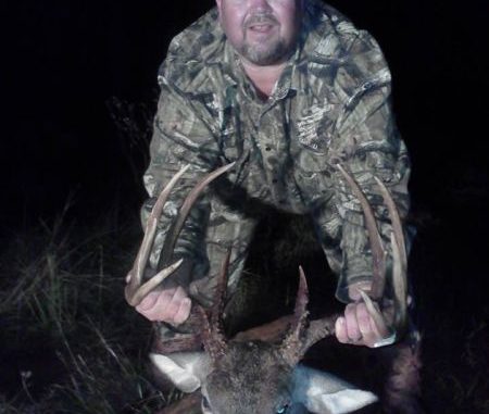 “It started to get late and I knew I didn’t have much time left to hunt that day. Then I heard some wood ducks get up and fly out of a slough on my right and I wondered if something had spooked them. Suddenly a big doe burst from the pine thicket and shot across the pipeline. I repositioned my gun to the window facing the pipeline when the big buck stuck his head out of the thicket.”