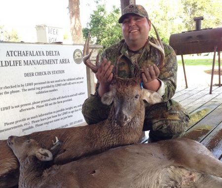 The 23-year-old from Napoleonville arrowed his first-ever deer — a doe — and then followed that up barely five nerve-wracking minutes later by shooting a nice 10-point buck with its nose to the ground on the very same trail.