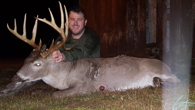 “I crawled up in the barn and soon after settling down, I looked down at one of my feeders 150 yards away and a doe stepped out. I was watching to see if perhaps the buck would be following her, and then I looked back behind my house and the big buck was at a feeder not 75 yards from my house — but some 300 yards from the barn where I sat,” he said. “I had put this feeder out near the house for my kids to get to watch deer and the buck was helping himself to the corn at the feeder right behind my house.”