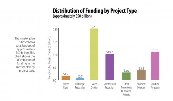 The state is a key player, as well. Louisiana’s Coastal Protection and Restoration Fund feeds into the larger pot, since it holds constitutionally dedicated revenues from sources such as state mineral leases. Money is also sometimes made available through the state’s annual spending plan and construction budget.