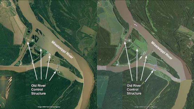 As detailed last week in Part I of this series, America’s Achilles’ Heel: the Mississippi River’s Old River Control Structure, the ORCS was built to act as a bulwark against the Mississippi River’s natural inclination to carve out a new channel to the Gulf of Mexico. The river wants to forge a path down the Atchafalaya River that is half as long and twice as steep as the river’s current channel, which takes it past Baton Rouge and New Orleans. The ORCS consists of four major water control structures which allow no more than 30% of the Mississippi River to flow into the Atchafalaya River: the Low Sill Structure and Overbank Structure (built in 1963), the Auxiliary Structure (completed in 1987), and the Sidney A. Murray Junior Hydroelectric Plant (completed in 1990).