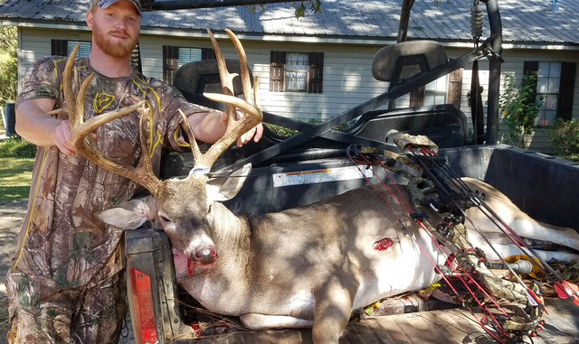 “He ran about 20 yards, bouncing off trees and fell. I saw him kick a couple of times and I recalled having a big 8-point I once shot get up and run after being down, so I put another arrow in him and finished him off.”