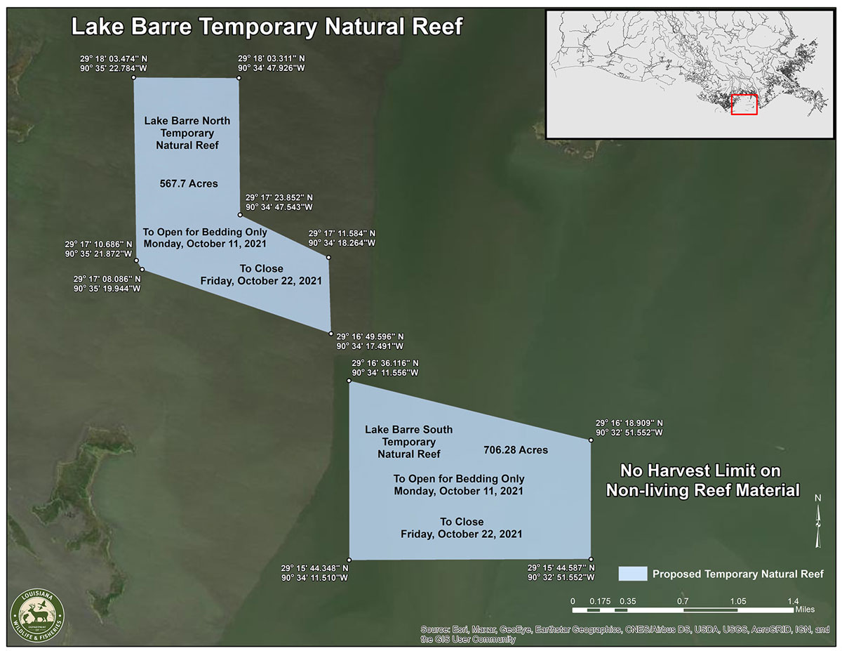 - If a vessel is harvesting from the Lake Barre Temporary Natural Reef, all oysters on that vessel are deemed to have been taken from the Lake Barre Temporary Natural Reef.