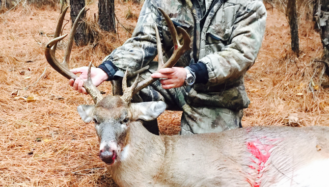 About 15 minutes later, he headed down from his box stand to investigate and found bright red lung blood where the buck had stood, then located it 50 yards away piled up next to a small tree.
