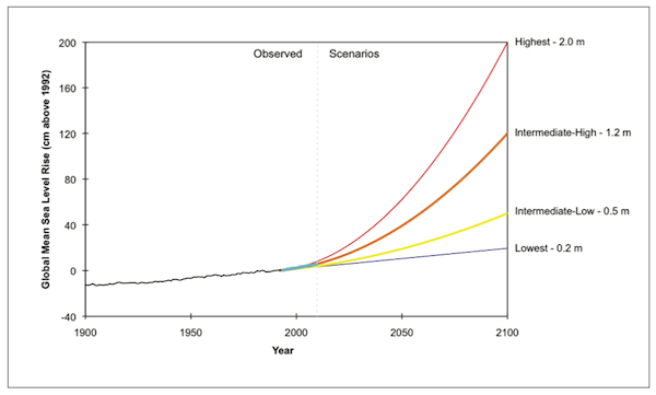 The assessment provides four scenarios for global average sea-level rise through the end of the century, based on varying scenarios of warming and ice melt: