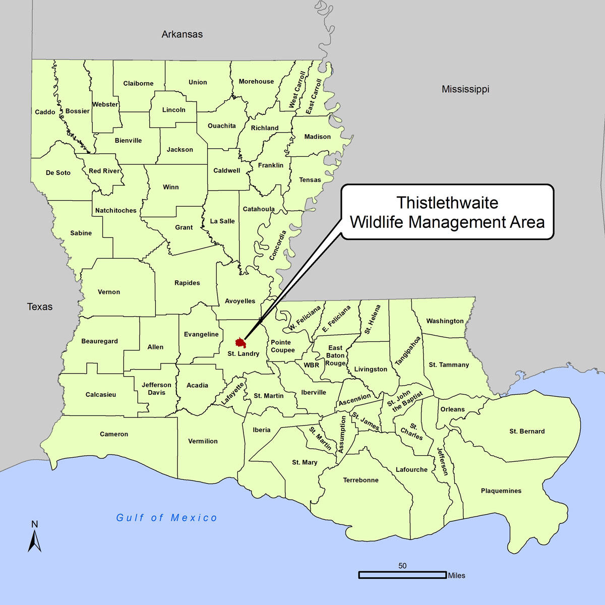 Thistlethwaite WMA is located immediately northeast of Washington off Louisiana Highway 10. You can also access the WMA via I-49 at the Lebeau exit.
