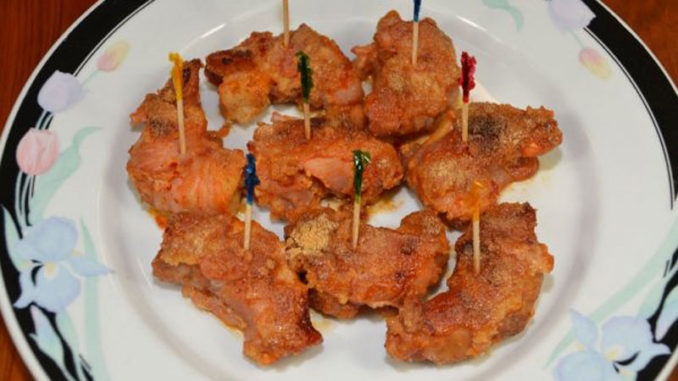 Spread the shrimp tails on a large pan and season them liberally with salt, pepper and Creole seasoning. Be careful not to add too much salt, as the Creole seasoning has salt in it. Cut the bacon slices in half. Wrap each shrimp with a half-slice of bacon spirally to cover the entire shrimp. Place the shrimp snugly in a baking pan as they are wrapped. Pre-heat an oven to 425 degrees. Pour the Tiger Sauce evenly over the shrimp. Shake a heavy layer of garlic powder over the sauced shrimp. Rick cautions that it will look like too much garlic powder, but it isn’t. Place the pan in the oven and bake for 45 minutes or until the bacon on top is lightly toasted. Serves 30 as an appetizer.