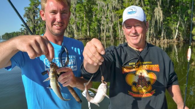 Both enjoy the fast-paced action of springtime Des Allemands catfishing. “I’m not a normal bass fisherman. I hate fishing plastic worms,” confessed Rudy. “They are too slow. I like to catch fish.”