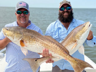 Neal Laws and his son Shane Laws showing off the best two out of the five redfish they caught while fishing out of Cocodrie, LA.