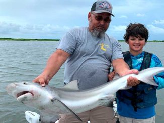 Slade Dowden and his Paw Paw Andy Martarona show off Slade’s 46-inch long shark that was released afterwards.[…]
